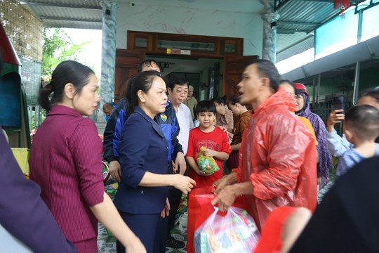 | Phó Chủ tịch - Tổng Thư ký Nguyễn Thị Thu Hà tặng quà cho người dân vùng ngập lụt tại điểm tránh trú an toàn. |