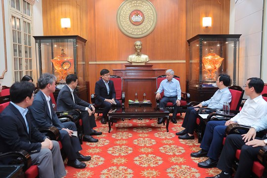 Ông Đỗ Văn Chiến, Ủy viên Bộ Chính trị, Bí thư Trung ương Đảng, Chủ tịch Ủy ban Trung ương MTTQ Việt Nam trao đổi cùng Samsung Việt Nam. Ảnh Hoài Nam |