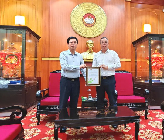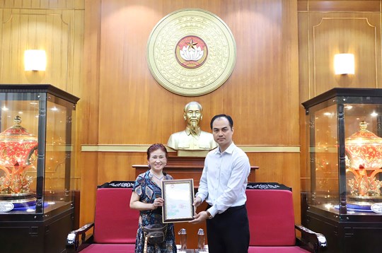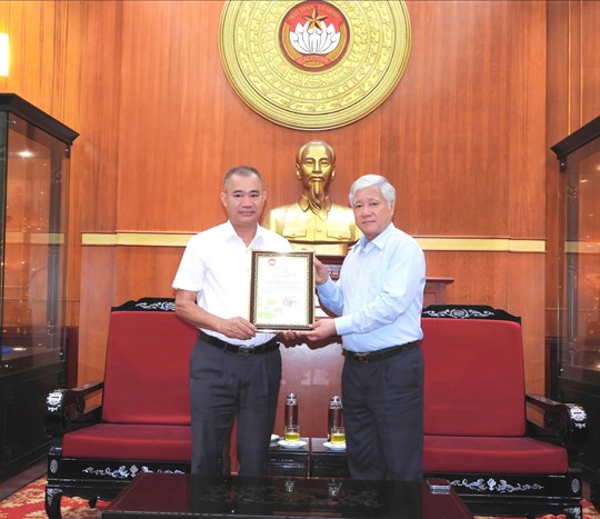 Ông Đỗ Văn Chiến, Ủy viên Bộ Chính trị, Bí thư Trung ương Đảng, Chủ tịch Ủy ban Trung ương MTTQ Việt Nam trao thư cảm ơn Samsung Việt Nam. Ảnh Hoài Nam |
