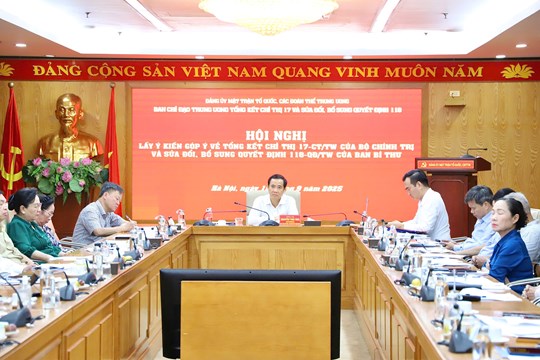(Mặt trận) - Chiều ngày 18/9, tại Trụ sở Đảng ủy MTTQ, các đoàn thể Trung ương, Ban Chỉ đạo Trung ương Tổng kết Chỉ thị 17 và sửa đổi Quyết định số 118 đã tổ chức Hội nghị lấy ý kiến góp ý về tổng kết Chỉ thị 17-CT/TW của Bộ Chính trị và sửa đổi, bổ sung Quyết định 118/QĐ-TW của Ban Bí thư. Đồng chí Nguyễn Thái Học, Phó Bí thư Đảng ủy MTTQ, các đoàn thể Trung ương chủ trì Hội nghị.