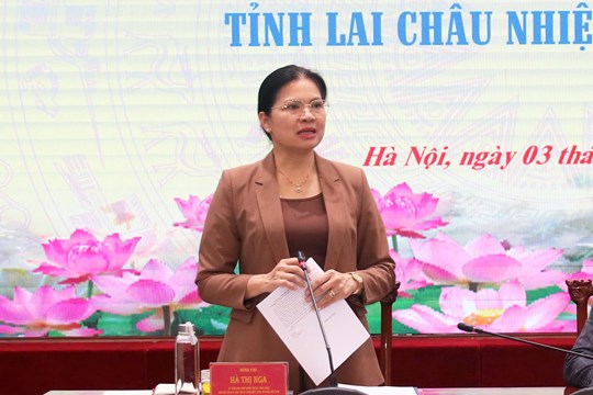 Phát biểu tại cuộc làm việc, Phó Chủ tịch Hà Thị Nga đánh giá cao và cảm ơn sự quan tâm đặc biệt của Ban Thường vụ Tỉnh ủy, Thường trực Tỉnh ủy Lai Châu trong công tác lãnh đạo, chỉ đạo; sự phối hợp của UBND, HĐND tỉnh, các sở, ngành của tỉnh trong công tác phối hợp tổ chức Đại hội MTTQ Việt Nam các cấp và công tác tổ chức Đại hội MTTQ Việt Nam tỉnh Lai Châu nhiệm kỳ 2025 - 2030; đồng thời hoan nghênh Ban Thường trực Ủy ban MTTQ Việt Nam tỉnh Lai Châu đã tích cực, chủ động triển khai và chuẩn bị các nội dung liên quan tới Đại hội đại biểu MTTQ Việt Nam tỉnh Lai Châu nhiệm kỳ 2025 - 2030.