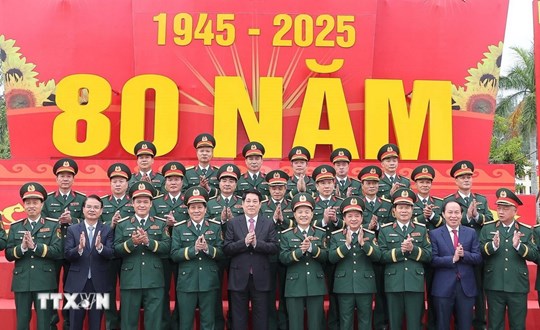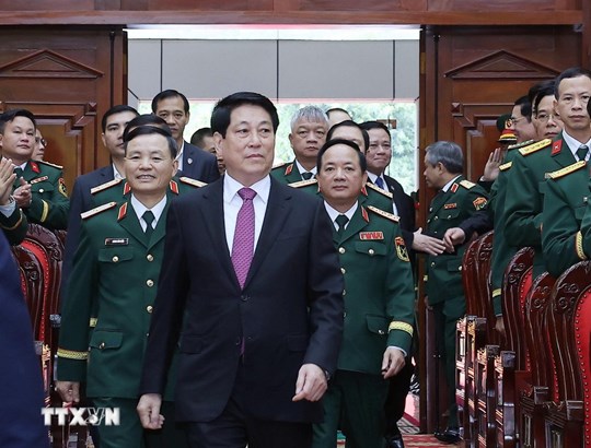 | Chủ tịch nước Lương Cường chúc mừng Lực lượng vũ trang Quân khu 3. Ảnh: Lâm Khánh/TTXVN |
