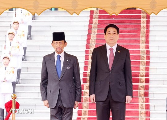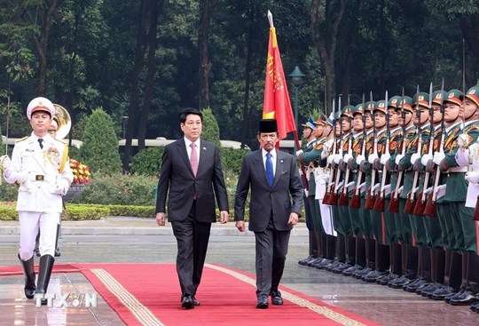 | Chủ tịch nước Lương Cường đón Quốc vương Brunei Darussalam Haji Hassanal Bolkiah. Ảnh: Lâm Khánh/TTXVN |