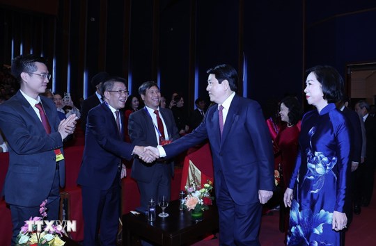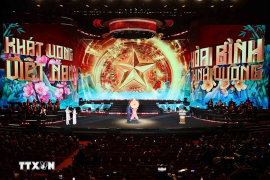Chủ tịch nước Lương Cường và Phu nhân cùng các đại biểu dự Chương trình nghệ thuật đặc biệt Xuân Quê hương 2026. Ảnh: An Đăng/TTXVN