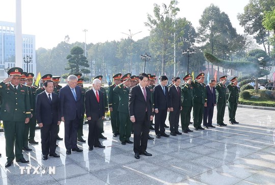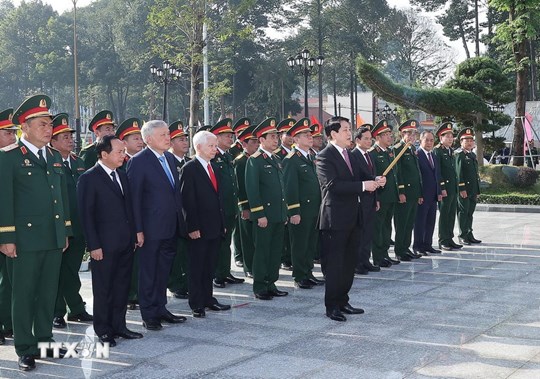 Trước đó, Chủ tịch nước và các đại biểu đã đến dâng hương, dâng hoa tại Tượng đài Bác Hồ và trồng cây lưu niệm trong khuôn viên Quân khu 7./.