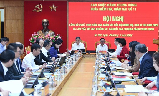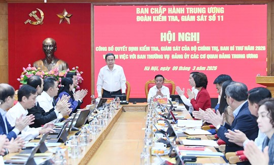 (Mặt trận) - Sáng 9/3, Ủy viên Bộ Chính trị, Bí thư Đảng ủy Quốc hội, Chủ tịch Quốc hội Trần Thanh Mẫn - Trưởng Đoàn Kiểm tra, giám sát của Bộ Chính trị, Ban Bí thư năm 2026 (Đoàn Kiểm tra số 11) và Ủy viên Bộ Chính trị, Thường trực Ban Bí thư, Bí thư Đảng ủy các Cơ quan Đảng Trung ương Trần Cẩm Tú đồng chủ trì Hội nghị công bố quyết định kiểm tra, giám sát của Bộ Chính trị, Ban Bí thư năm 2026 và làm việc với Ban Thường vụ Đảng ủy các cơ quan Đảng Trung ương.