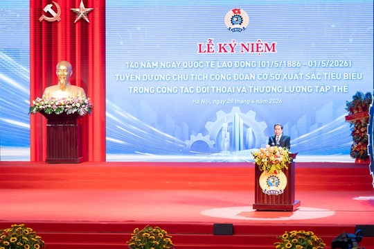 (Mặt trận) - Sáng 28/4, tại Cung Văn hóa Lao động hữu nghị Việt - Xô, Hà Nội, Ủy viên Bộ Chính trị, Chủ tịch Quốc hội Trần Thanh Mẫn dự Lễ kỷ niệm 140 năm Ngày quốc tế lao động (1/5/1886 - 1/5/2026) và tuyên dương Chủ tịch công đoàn cơ sở xuất sắc tiêu biểu trong công tác đối thoại và thương lượng tập thể.