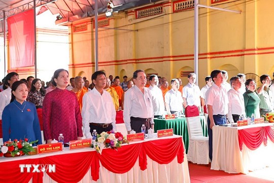 | Chủ tịch Quốc hội Trần Thanh Mẫn; Chủ tịch Hội đồng Dân tộc Lâm Văn Mẫn; Bí thư Thành ủy Cần Thơ Lê Quang Tùng; Phó Chủ tịch Ủy ban Trung ương MTTQ Việt Nam Hà Thị Nga cùng các đại biểu dự Ngày hội thực hiện nghi thức chào cờ. Ảnh: TTXVN |