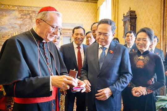(Mặt trận) - Trưa 11/4, giờ địa phương, chiều cùng ngày giờ Việt Nam, sau khi đến Rome, Chủ tịch Quốc hội Trần Thanh Mẫn đã hội kiến Thủ tướng Tòa thánh Vatican Pietro Parolin.