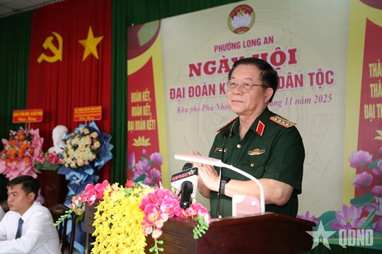 (Mặt trận) - Sáng 17/11, Đại tướng Nguyễn Trọng Nghĩa, Ủy viên Bộ Chính trị, Bí thư Trung ương Đảng, Ủy viên Thường vụ Quân ủy Trung ương, Chủ nhiệm Tổng cục Chính trị Quân đội nhân dân (QĐND) Việt Nam dự Ngày hội Đại đoàn kết toàn dân tộc tại khu phố Phú Nhơn (phường Long An, tỉnh Tây Ninh).