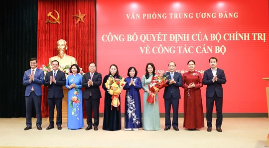 | Các đồng chí lãnh đạo Văn phòng Trung ương Đảng tặng hoa chúc mừng đồng chí Nguyễn Thị Thu Hà và đồng chí Lâm Thị Phương Thanh. |