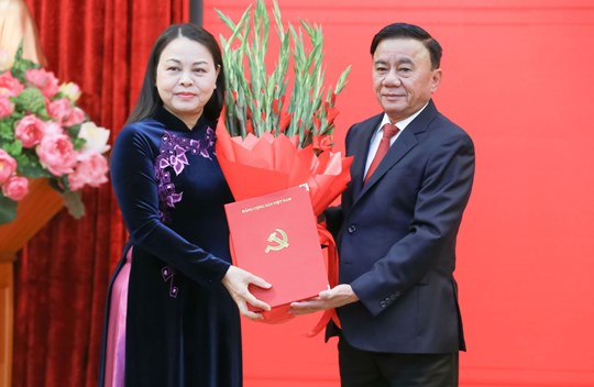 | Đồng chí Trần Cẩm Tú, Ủy viên Bộ Chính trị, Thường trực Ban Bí thư trao quyết định của Bộ Chính trị cho đồng chí Nguyễn Thị Thu Hà |