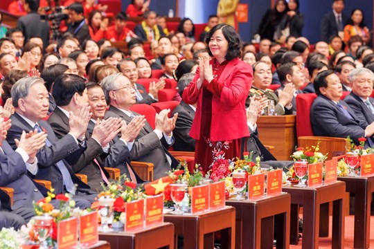| Ủy viên Bộ Chính trị, Bí thư Trung ương Đảng, Chủ tịch Ủy ban Trung ương Mặt trận Tổ quốc Việt Nam Bùi Thị Minh Hoài, Phó Chủ tịch Hội đồng Thi đua-Khen thưởng Trung ương chụp ảnh lưu niệm cùng các đại biểu tham dự Đại hội Thi đua yêu nước toàn quốc lần thứ XI |