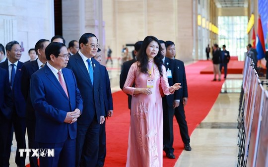 | Thủ tướng Phạm Minh Chính và Thủ tướng Lào Sonexay Siphandone tham quan trưng bày ảnh về quan hệ hợp tác giữa hai nước do Thông tấn xã Việt Nam thực hiện. Ảnh: Dương Giang/TTXVN |