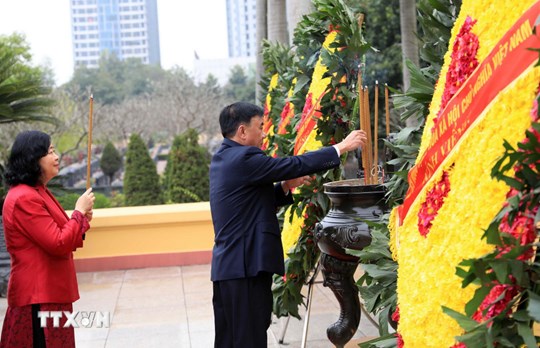 | Đoàn đại biểu lãnh đạo Đảng, Nhà nước, Ủy ban Trung ương Mặt trận Tổ quốc Việt Nam dâng hương tưởng niệm các vị tiền bối cách mạng và các Anh hùng, liệt sỹ tại Nghĩa trang Mai Dịch. Ảnh: Văn Điệp/TTXVN |