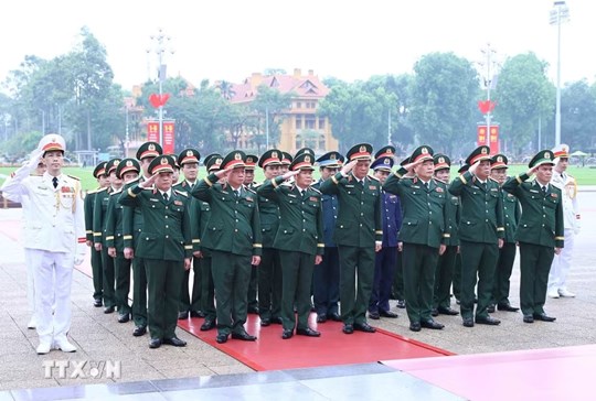 | Đoàn đại biểu Quân ủy Trung ương, Bộ Quốc phòng thành kính tưởng niệm Chủ tịch Hồ Chí Minh. (Ảnh: An Đăng/TTXVN) |
