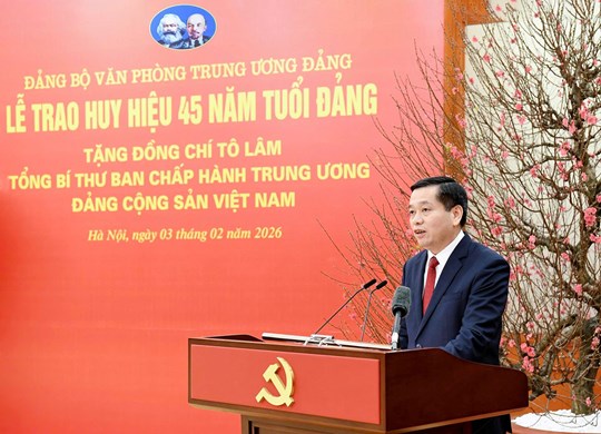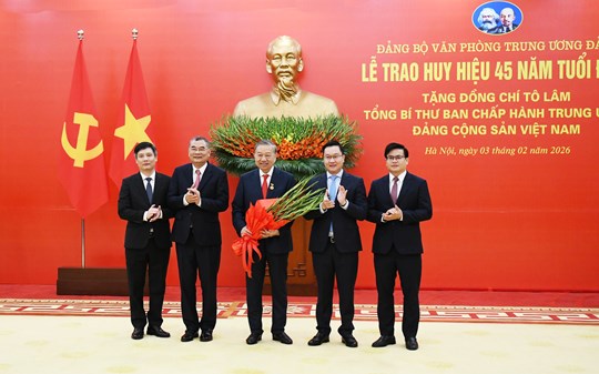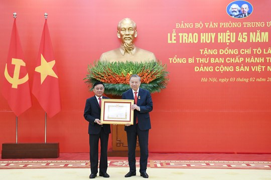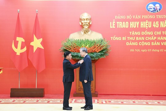 (Mặt trận) - Sáng nay, 3/2, trong không khí phấn khởi kỷ niệm 96 năm thành lập Đảng Cộng sản Việt Nam quang vinh và chào mừng Đại hội XIV của Đảng thành công rực rỡ, Đảng bộ Văn phòng Trung ương Đảng đã tổ chức Lễ trao Huy hiệu 45 năm tuổi Đảng tặng Tổng Bí thư Tô Lâm.