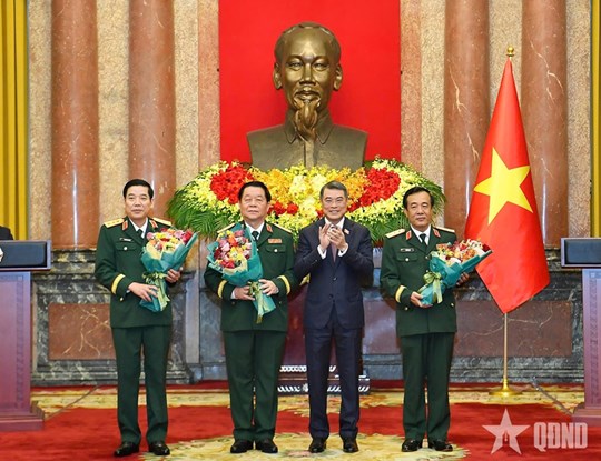 Chủ tịch nước nêu rõ, ba đồng chí được bổ nhiệm, thăng quân hàm là những cán bộ ưu tú của Đảng, Nhà nước và Quân đội nhân dân; đều được đào tạo cơ bản, có hệ thống, trưởng thành từ đơn vị, cơ sở; được rèn luyện, thử thách qua rất nhiều cương vị, lĩnh vực, môi trường công tác khác nhau, dù trong bất cứ điều kiện, hoàn cảnh nào, các đồng chí luôn thể hiện là những cán bộ có bản lĩnh chính trị vững vàng, phẩm chất đạo đức cách mạng trong sáng; gương mẫu, tận tụy, trách nhiệm; luôn hoàn thành tốt và xuất sắc mọi nhiệm vụ được giao. Trong quá trình công tác, các đồng chí đã lập được nhiều thành tích, chiến công xuất sắc, được Đảng, Nhà nước, Quân ủy Trung ương, Bộ Quốc phòng và bạn bè quốc tế tặng thưởng nhiều phần thưởng cao quý.
