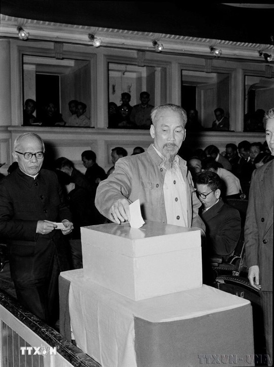| Chủ tịch Hồ Chí Minh bỏ lá phiếu đầu tiên bầu Ban Thường trực Quốc hội mới tại Kỳ họp thứ 6, Quốc hội khóa I. (Ảnh: TTXVN) |