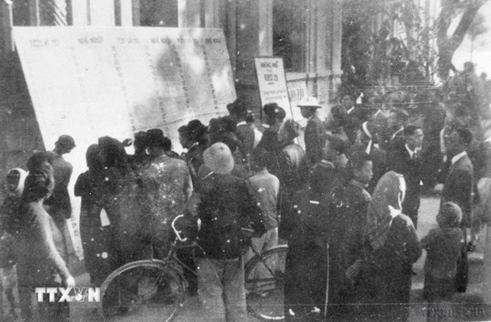 | Cử tri Thủ đô xem danh sách, tiểu sử các đại biểu ra ứng cử năm 1946. (Ảnh: Tư liệu TTXVN) |