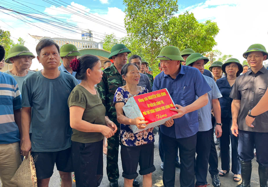 Phó Thủ tướng Thường trực Chính phủ Nguyễn Hoà Bình thăm hỏi, động viên người dân tại khu vực bị ngập lụt do vỡ đê bối tại xã Tiên Lục - Ảnh: VGP/Nguyễn Hoàng |