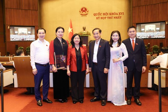 | Bà Bùi Thị Minh Hoài, Uỷ viên Bộ Chính trị, Bí thư Trung ương Đảng, Bí thư Đảng uỷ MTTQ, các đoàn thể Trung ương, Chủ tịch Uỷ ban Trung ương MTTQ Việt Nam chụp ảnh lưu niệm với các đại biểu Quốc hội. |