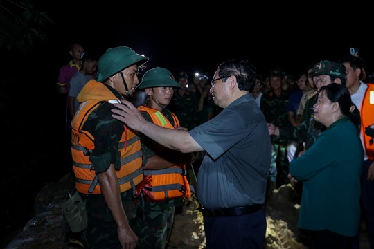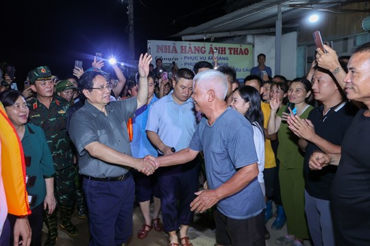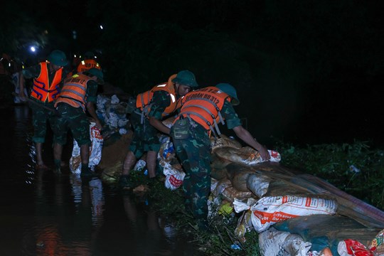 Đến động viên các lực lượng đang làm nhiệm vụ hộ đê, Thủ tướng cảm ơn các cán bộ, chiến sĩ đã làm xuyên đêm với tinh thần trách nhiệm cao nhất, khẩn trương nhất; đề nghị các lực lượng phân công nhiệm vụ hợp lý, có cách làm khoa học, hiệu quả nhất, kịp thời phát hiện, ứng phó, khắc phục kịp thời các sự cố dù nhỏ nhất ngay khi mới xảy ra.