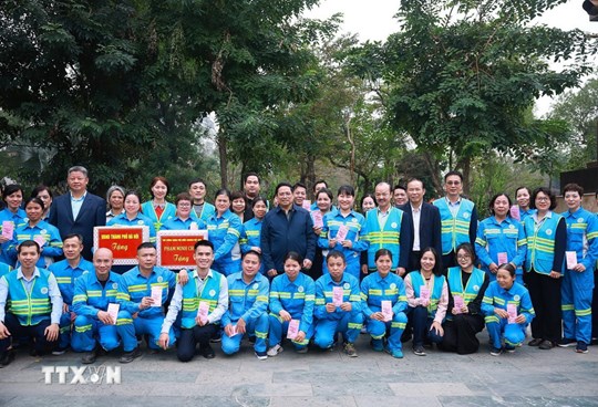 Thủ tướng Phạm Minh Chính thăm, chúc Tết công nhân vệ sinh môi trường tại Hà Nội. Ảnh: Dương Giang/TTXVN