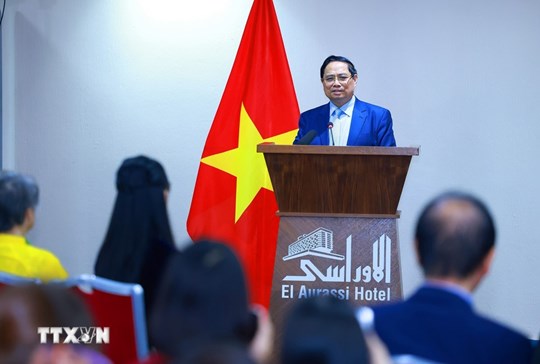 Phát biểu tại buổi gặp mặt, Thủ tướng Chính phủ Phạm Minh Chính trân trọng cảm ơn những tình cảm của bà con người Việt Nam tại Algeria dành cho Đoàn, cũng như dành cho quê hương, đất nước; khẳng định “tình dân tộc, nghĩa đồng bào” của bà con cũng như bao người Việt Nam khác ở trong cũng như ngoài nước.