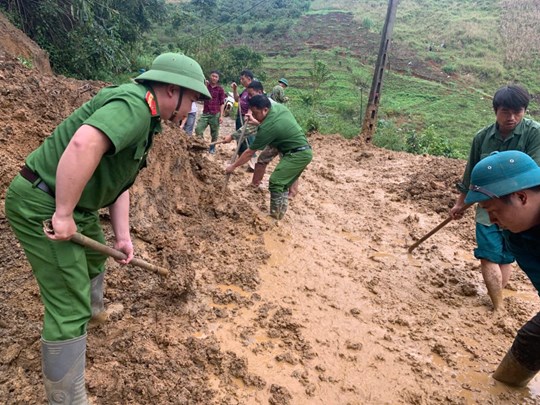 Công an xã Lóng Phiêng (tỉnh Sơn La) giúp dân san lấp bùn đất do mưa lũ kéo dài. |
