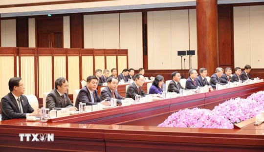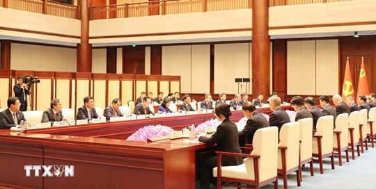 Đoàn đại biểu Việt Nam do đồng chí Trần Cẩm Tú dẫn đầu tại buổi hội đàm.(Ảnh: Công Tuyên/TTXVN)