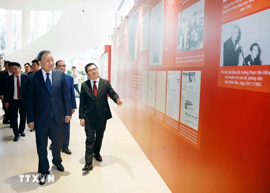 Tổng Bí thư Tô Lâm tham quan trưng bày ảnh của Báo Nhân Dân. Ảnh: Thống Nhất/TTXVN