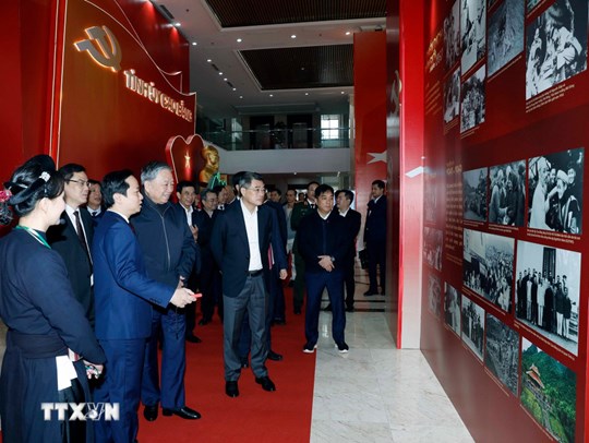 | Tổng Bí thư Tô Lâm và các đại biểu tham quan không gian trưng bày tại cuộc làm việc với Ban Chấp hành Đảng bộ tỉnh Cao Bằng. Ảnh: Thống Nhất/TTXVN |