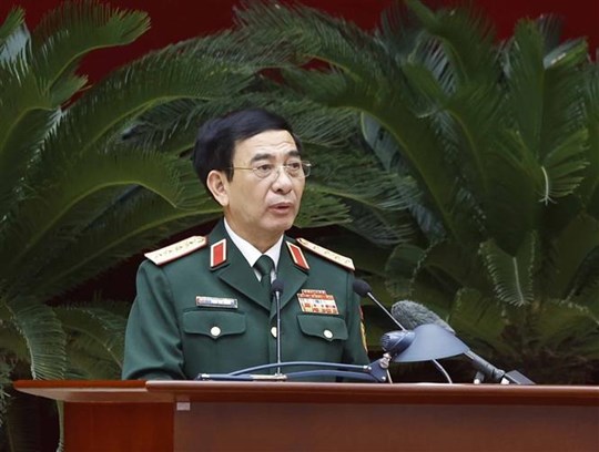 | Đại tướng Phan Văn Giang, Uỷ viên Bộ Chính trị, Phó Bí thư Quân uỷ Trung ương, Phó Thủ tướng, Bộ trưởng Bộ Quốc phòng, đại diện các đơn vị phát biểu. Ảnh: Thống Nhất/TTXVN |