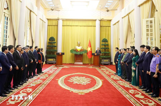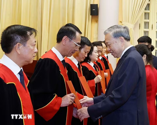 | Tổng Bí thư, Chủ tịch nước Tô Lâm trao Quyết định bổ nhiệm chức danh Thẩm phán Toà án nhân dân Tối cao cho các thẩm phán. Ảnh: Thống Nhất/TTXVN |