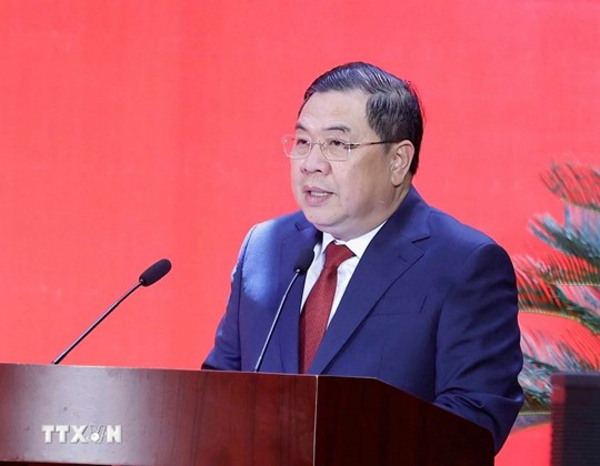 | Đồng chí Phạm Gia Túc, Ủy viên Trung ương Đảng, Chánh Văn phòng Trung ương Đảng phát biểu khai mạc triển lãm (Ảnh: Thống Nhất/TTXVN) |