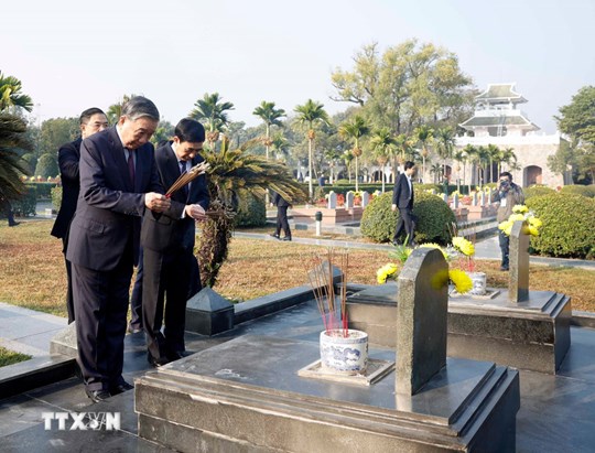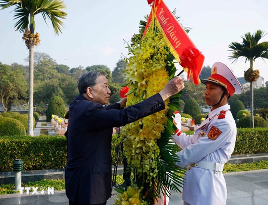 Tổng Bí thư Tô Lâm và Đoàn công tác Trung ương dâng hoa, dâng hương tưởng niệm Anh hùng liệt sĩ tại Nghĩa trang Liệt sĩ Quốc gia A1. Ảnh: Thống Nhất/TTXVN
