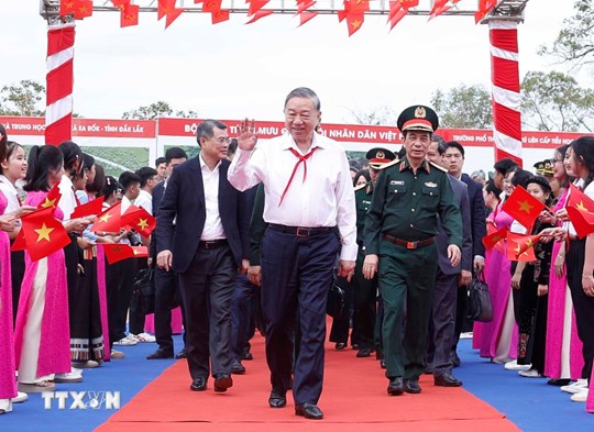 | Tổng Bí thư Tô Lâm và các đại biểu phát lệnh khởi công xây dựng Trường Phổ thông nội trú liên cấp Tiểu học, Trung học cơ sở xã Ea Rốk (tỉnh Đắk Lắk). Ảnh: Thống Nhất/TTXVN |