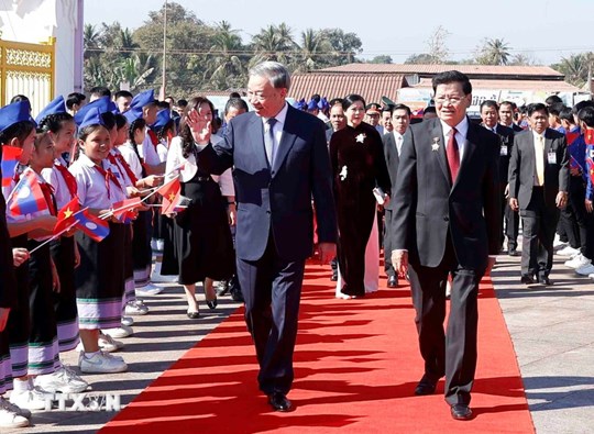 (Mặt trận) - Trong khuôn khổ chuyến thăm cấp Nhà nước Cộng hòa Dân chủ Nhân dân Lào, dự Lễ kỷ niệm 50 năm Quốc khánh nước Cộng hòa Dân chủ Nhân dân Lào và đồng chủ trì Cuộc gặp cấp cao giữa Đảng Cộng sản Việt Nam và Đảng Nhân dân Cách mạng Lào, trưa 2/12, Tổng Bí thư Tô Lâm và Phu nhân cùng đoàn Đại biểu cấp cao Việt Nam đã dự Lễ khánh thành Công viên Hữu nghị Lào-Việt Nam ở thủ đô Vientiane.