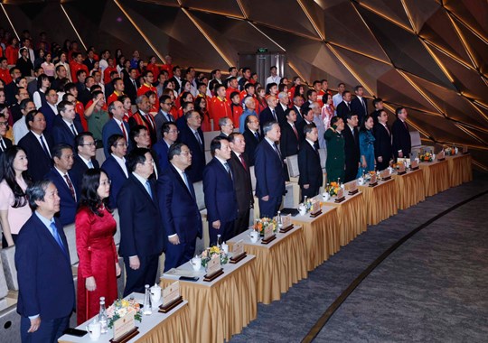 | Tổng Bí thư Tô Lâm và các đại biểu dự Lễ kỷ niệm 80 năm Ngày truyền thống Ngành Thể dục Thể thao. Ảnh: Thống Nhất/TTXVN |