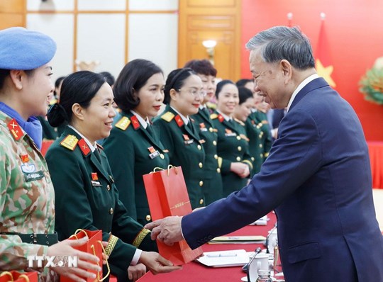 Phát biểu tại buổi gặp mặt, Tổng Bí thư Tô Lâm nhấn mạnh, trong suốt chiều dài lịch sử dựng nước và giữ nước của dân tộc, phụ nữ nước ta luôn đóng vai trò quan trọng và có những cống hiến to lớn để xây dựng non sông đất nước ngày càng “đàng hoàng hơn, to đẹp hơn”, “sánh vai với các cường quốc ở năm châu”, rất nhiều chiến công hiển hách của “đội quân tóc dài” được ghi nhận, tôn vinh. Từ khi có Đảng lãnh đạo, các thế hệ phụ nữ Việt Nam luôn phát huy phẩm chất con rồng cháu tiên, bà Trưng, bà Triệu, hiền hậu, thủy chung, khắc phục mọi khó khăn, gian khổ, sẵn sàng hy sinh để xây dựng và bảo vệ Tổ quốc. Tổng Bí thư nhắc lại, Chủ tịch Hồ Chí Minh từng nói: “Non sông gấm vóc Việt Nam do phụ nữ ta, trẻ cũng như già, ra sức dệt thêu mà thêm tốt đẹp, rực rỡ”. Bác đã khen tặng Phụ nữ Việt Nam 8 chữ vàng “Anh hùng, bất khuất, trung hậu, đảm đang”.