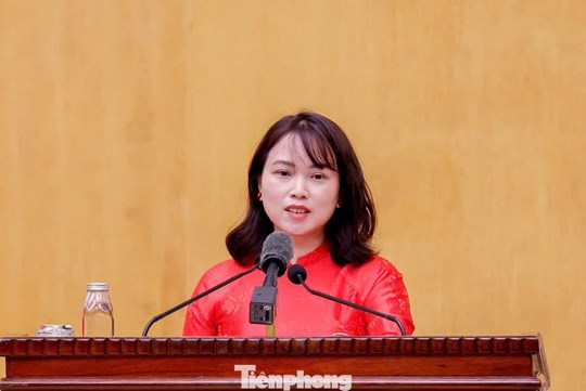 | Ứng cử viên ứng cử đại biểu Quốc hội khóa XVI: Bà Vũ Lan Phương, Chuyên viên Văn phòng HĐND - UBND phường Cửa Nam, trình bày chương trình hành động với cử tri. |
