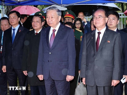 Nhân dịp này, Tổng Bí thư Tô Lâm và Ủy viên Thường vụ Bộ Chính trị, Bí thư Trung ương Đảng, Trưởng ban Tổ chức Trung ương Đảng Lao động Triều Tiên Cho Yong Won đã cắt băng khánh thành tượng Chủ tịch Hồ Chí Minh trong khuôn viên Đại sứ quán Việt Nam tại Triều Tiên./.