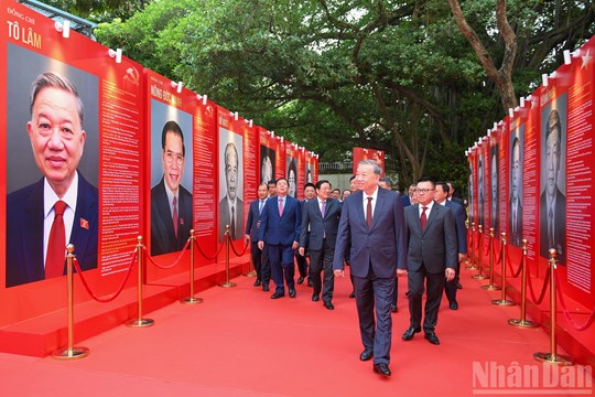 Tổng Bí thư Tô Lâm và các đại biểu tham quan khu triển lãm về các Tổng Bí thư của Đảng tại Báo Nhân Dân. (Ảnh: ĐĂNG KHOA) |