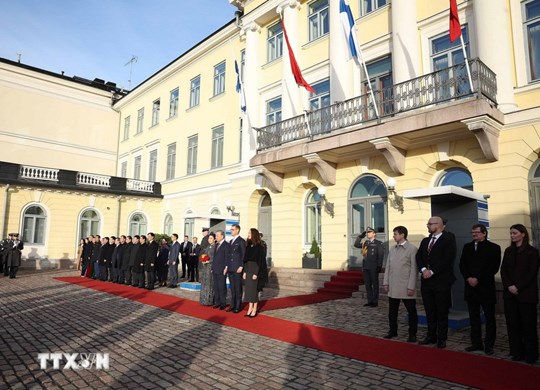 | Tổng thống Cộng hòa Phần Lan Alexander Stubb và Phu nhân chủ trì Lễ đón chính thức Tổng Bí thư Tô Lâm và Phu nhân thăm chính thức Cộng hòa Phần Lan. (Ảnh: Thống Nhất/TTXVN) |
