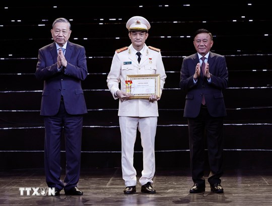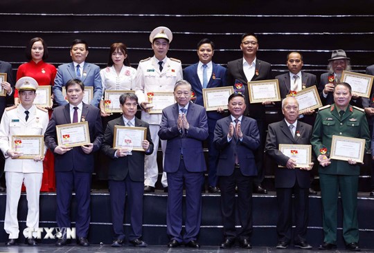 | Tổng Bí thư Tô Lâm và Ủy viên Bộ Chính trị, Thường trực Ban Bí thư Trần Cẩm Tú trao Giấy chứng nhận và biểu trưng cho các điển hình tiên tiến tiêu biểu. (Ảnh: Thống Nhất/TTXVN) |