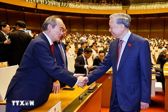 | Tổng Bí thư Tô Lâm với các đồng chí nguyên lãnh đạo Đảng, Nhà nước dự khai mạc Kỳ họp thứ Nhất, Quốc hội khóa XVI. Ảnh: Thống Nhất/TTXVN |