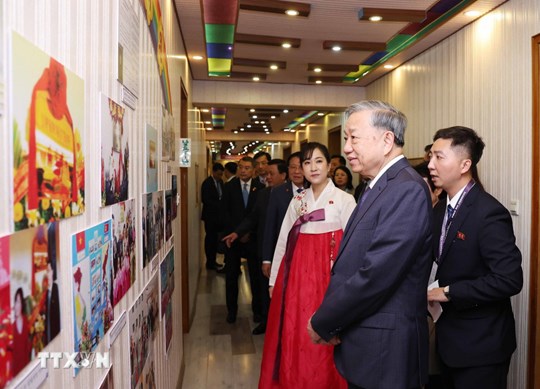 (Mặt trận) - Trong khuôn khổ chuyến thăm cấp Nhà nước Cộng hòa Dân chủ Nhân dân Triều Tiên, chiều 9/10 theo giờ địa phương, Tổng Bí thư Tô Lâm và Đoàn đại biểu cấp cao Việt Nam đã đến thăm Trường mẫu giáo Kiêng Sang và lớp học mang tên Chủ tịch Hồ Chí Minh.