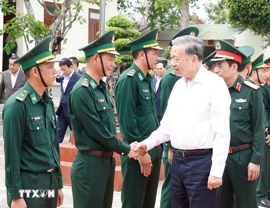 | Tổng Bí thư Tô Lâm, Bí thư Quân ủy Trung ương chúc Tết cán bộ chiến sỹ Đồn Biên phòng EA Hleo, tỉnh Đắk Lắk. (Ảnh: Thống Nhất/TTXVN) |