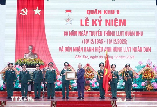 (Mặt trận) - Sáng 8/12, tại thành phố Cần Thơ, Đảng ủy Bộ Tư lệnh Quân khu 9 tổ chức trọng thể Lễ kỷ niệm 80 năm Ngày truyền thống lực lượng vũ trang Quân khu 9 (10/12/1945-10/12/2025) và đón nhận danh hiệu Anh hùng lực lượng vũ trang nhân dân. Tổng Bí thư Tô Lâm, Bí thư Quân ủy Trung ương dự và phát biểu chỉ đạo tại Lễ kỷ niệm.